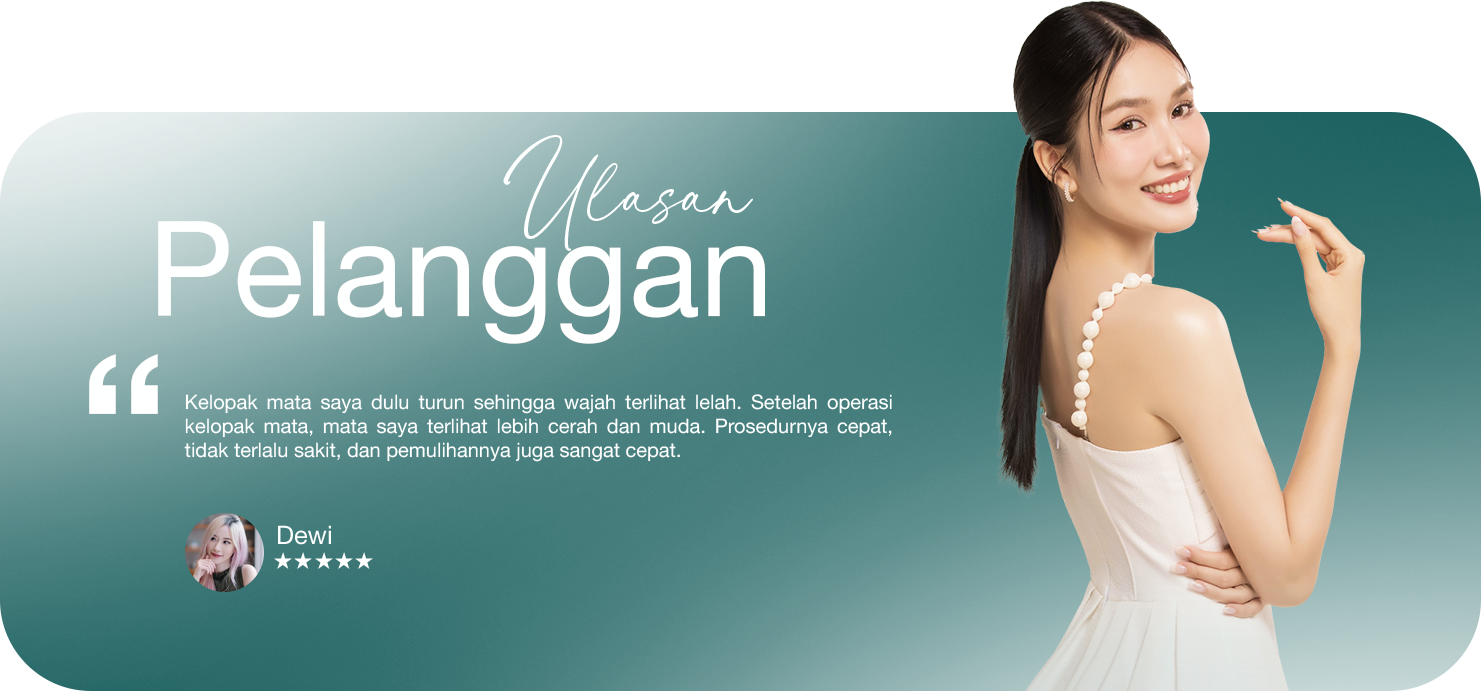 Menghilangkan kelopak mata terkulai, lipatan tunggal, kelebihan kulit, serta kantung lemak di bawah mata. Membentuk lipatan mata ganda yang alami...