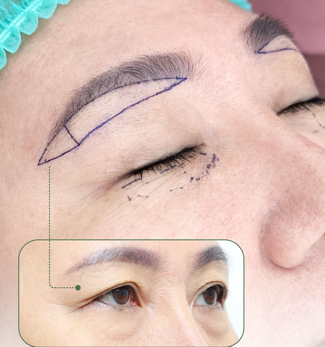 • A fine incision is made along the brow line to remove sagging skin and fat, then the brow is fixed with dissolvable aesthetic sutures.