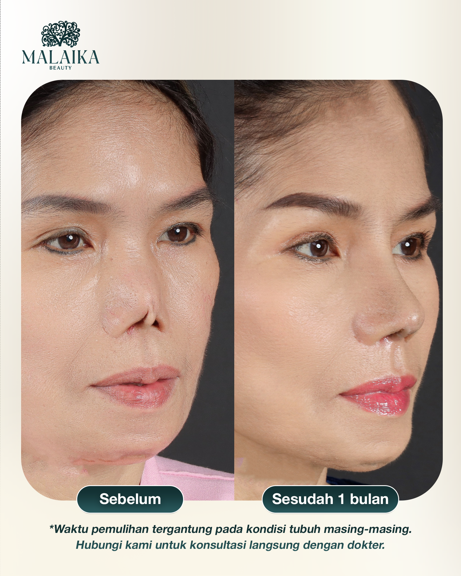 Foto perbandingan sebelum–sesudah beserta testimoni nyata dari pelanggan menjadi bukti nyata kualitas layanan dan keterampilan tim ahli di Malaika. Setiap prosedur pembesaran hidung yang sukses bukan hanya sekadar perubahan penampilan, tetapi juga merupakan perjalanan pelanggan untuk menemukan kembali rasa percaya diri dan kebahagiaan dalam hidup.